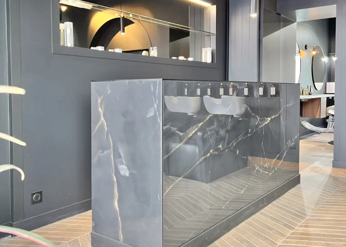 À l’intérieur, les lignes sobres et masculines sont mises en valeur par une série d’arches, qui structurent l’espace et créent une identité forte. La niche en arche, dédiée à la mise en avant des produits de soin, devient un élément de décoration à part entière.