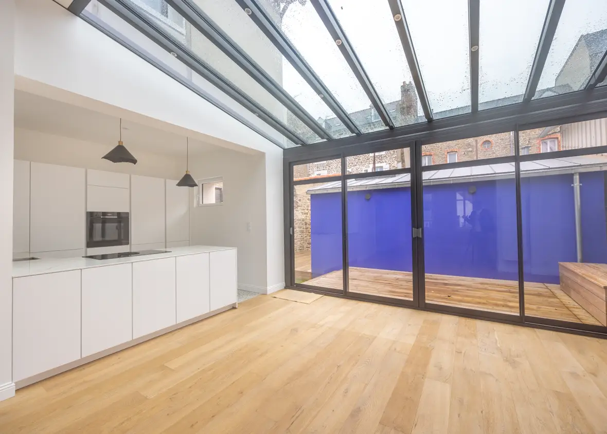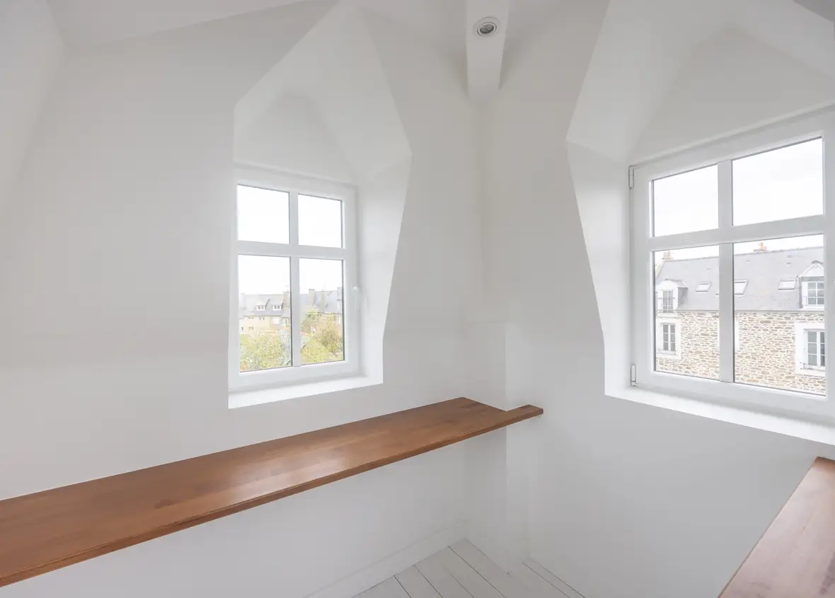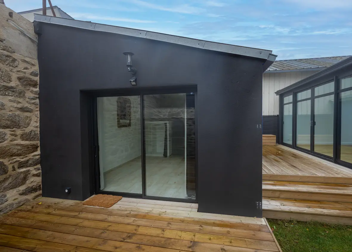 La façade en pierre apparente a été restaurée avec soin, dans le respect du patrimoine malouin. À l’arrière, l’extension moderne et la toiture entièrement vitrée créent un véritable puits de lumière, offrant une transition naturelle vers la terrasse en bois.