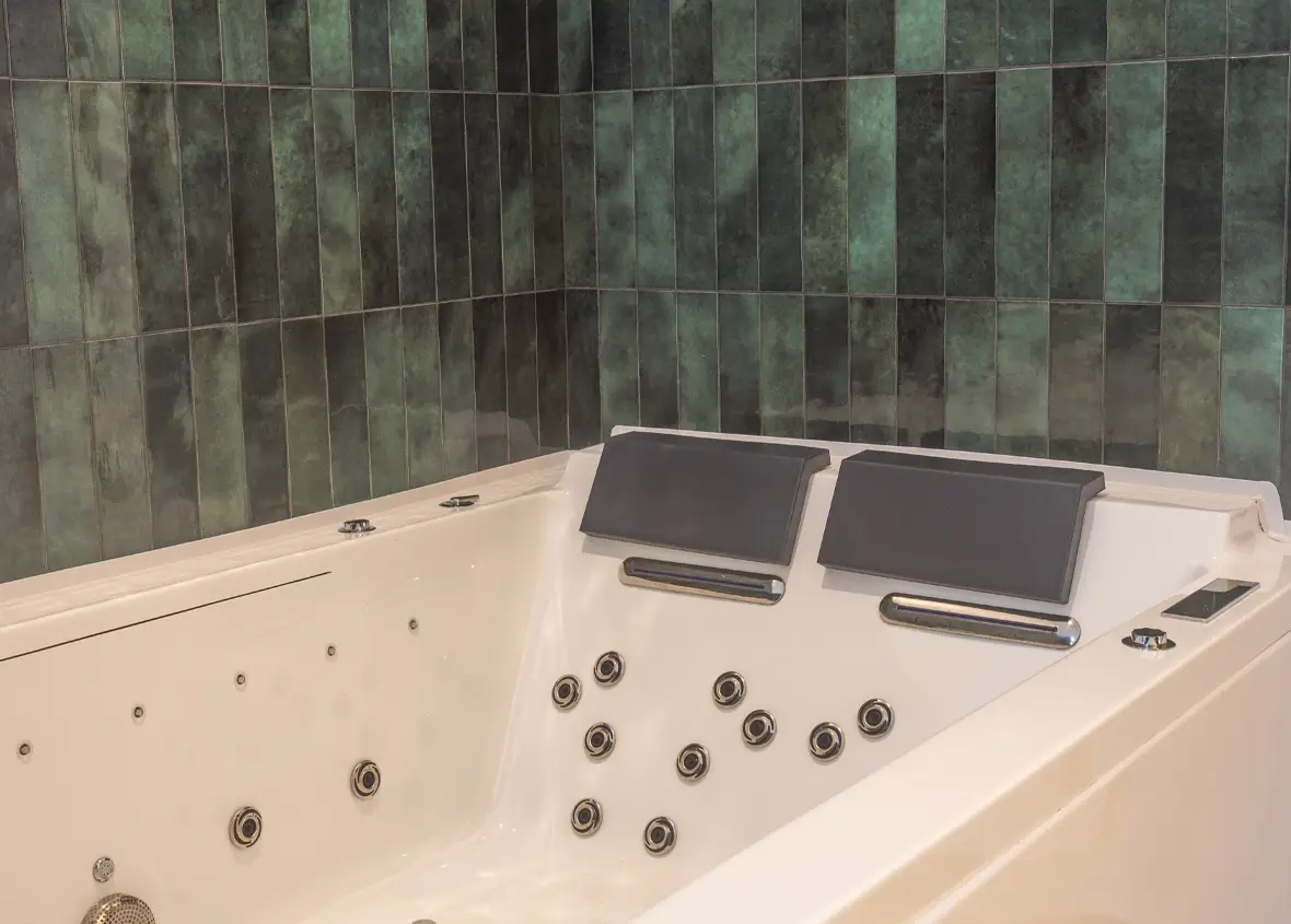 Les matériaux nobles, chêne, laiton, faïence artisanale, composent un ensemble harmonieux et élégant. La salle de bain, habillée d’un carrelage vert profond, se distingue par une ambiance chic et apaisante, soulignée par la robinetterie dorée. Une baignoire balnéo double vient compléter cet espace bien-être.