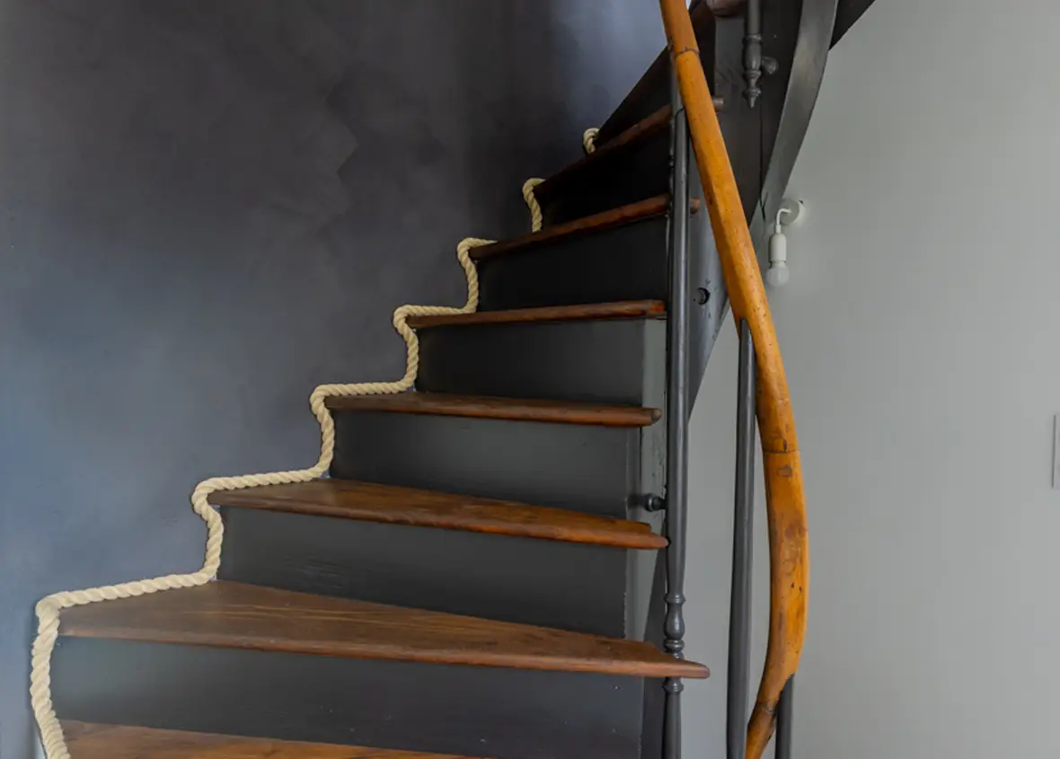 La cuisine, baignée de lumière grâce à la verrière, a été pensée comme un lieu de vie convivial et ouvert. Enfin, l’escalier d’origine a été rénové tout en conservant son âme : marches en bois, garde-corps métal, et un cordage marin en clin d’œil à la Côte d’Émeraude.