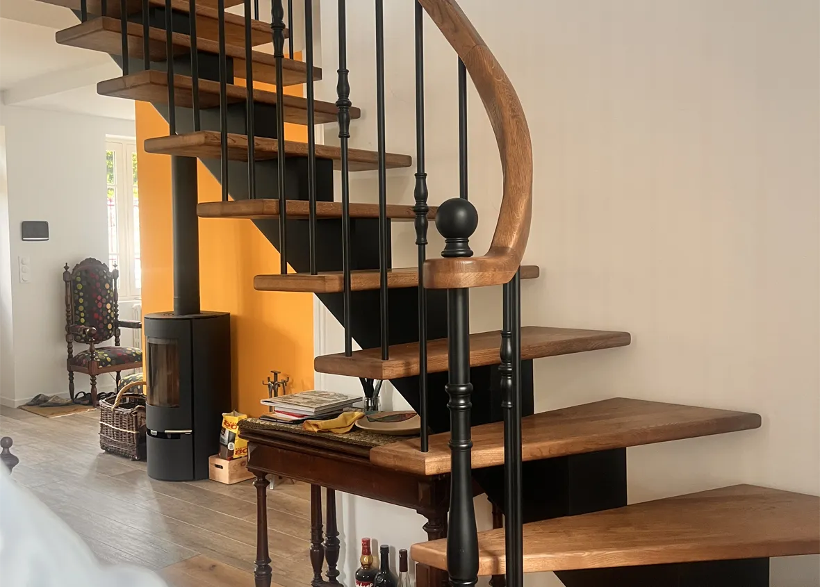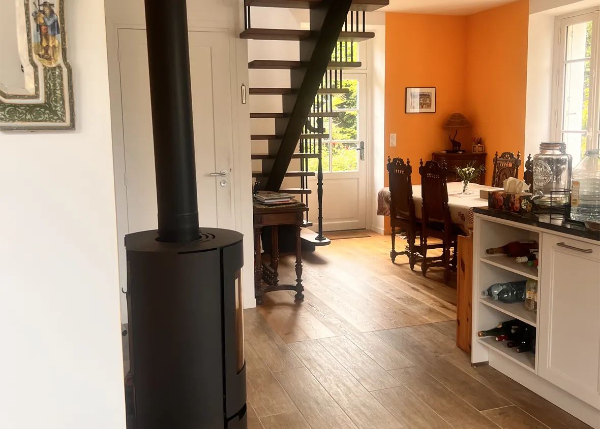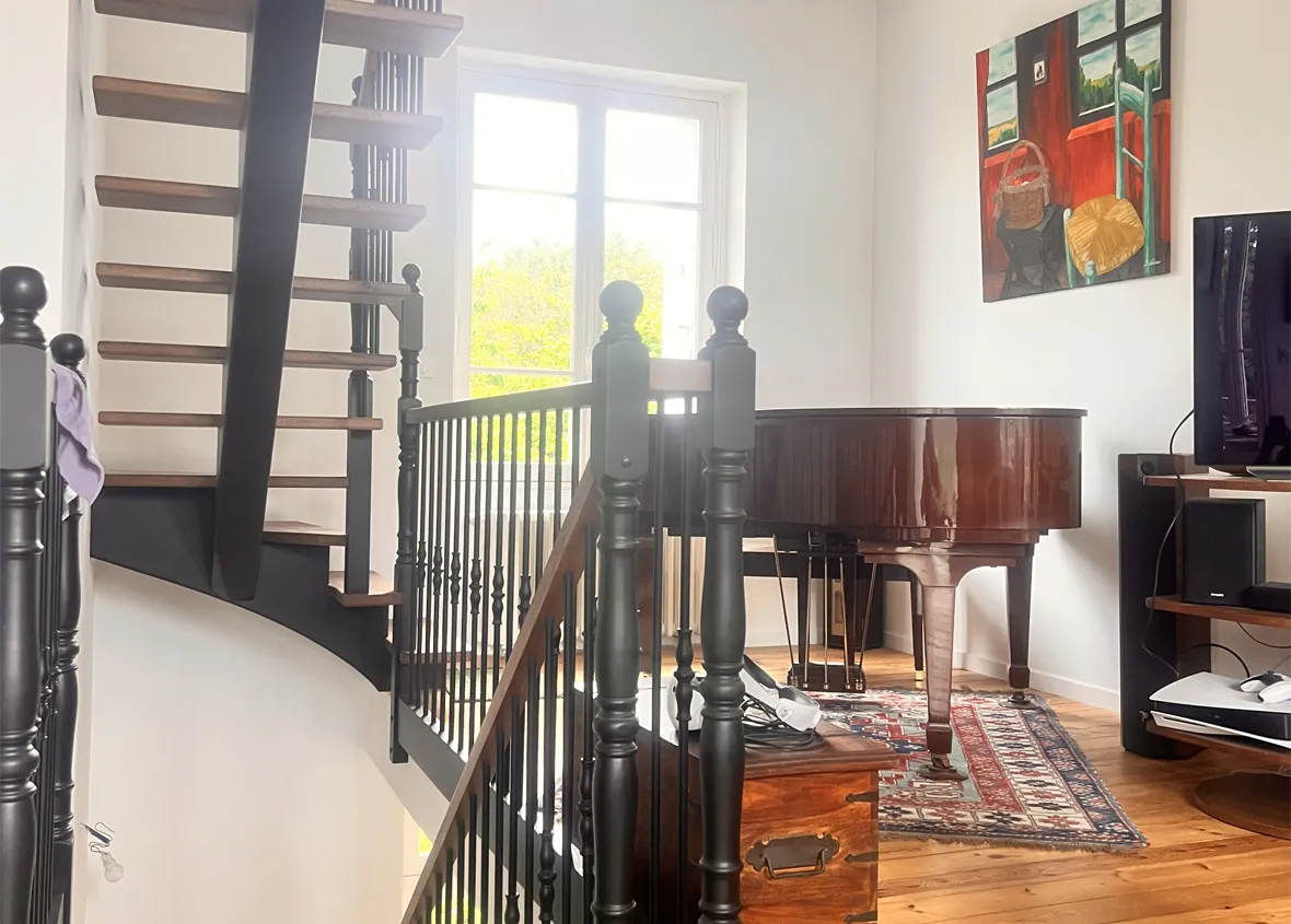 À l’intérieur, l’ambiance a été repensée autour de lignes sobres et élégantes. L’escalier a été remplacé par une version en bois noir, au design affirmé, devenant un véritable élément central de la décoration. Parquets posés à neuf, teintes chaleureuses, textures nobles… chaque choix a été guidé par l’esthétique autant que par le confort.